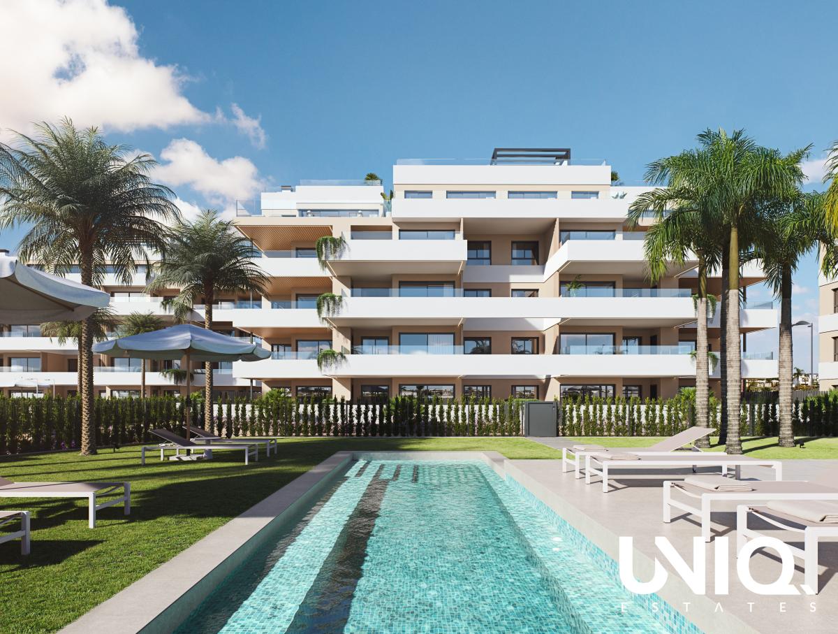 In the heart of Ciudad Quesada, where tranquility meets comfort, a new project is rising that will redefine your idea of living. In this residence you have the choice: a ground floor apartment with a cozy garden or a penthouse with impressive roof terraces - both with 2 or 3 bedrooms. Perfectly adapted to your lifestyle. The ground floor apartments radiate homeliness. Through the large sliding windows you step straight into your own garden, an ideal place for a quiet breakfast or a cosy barbecue. The penthouses, on the other hand, focus on space and panorama. Their generous solariums are equipped with water and light points and a prepared terrace area for jacuzzi and outdoor kitchen. A place that can thus be decorated to your heart's content. Inside, enjoy sophisticated finishes: large-format porcelain floors, walk-in showers with built-in niches, motorized shutters and a fully equipped designer kitchen with bar top. The units are designed with smart solar orientation and double facades for natural ventilation and maximum year-round living comfort. Each unit is connected to its own parking space. The common areas feature a beautiful green garden and a lovely swimming pool. Could this be something for you? Let us know!