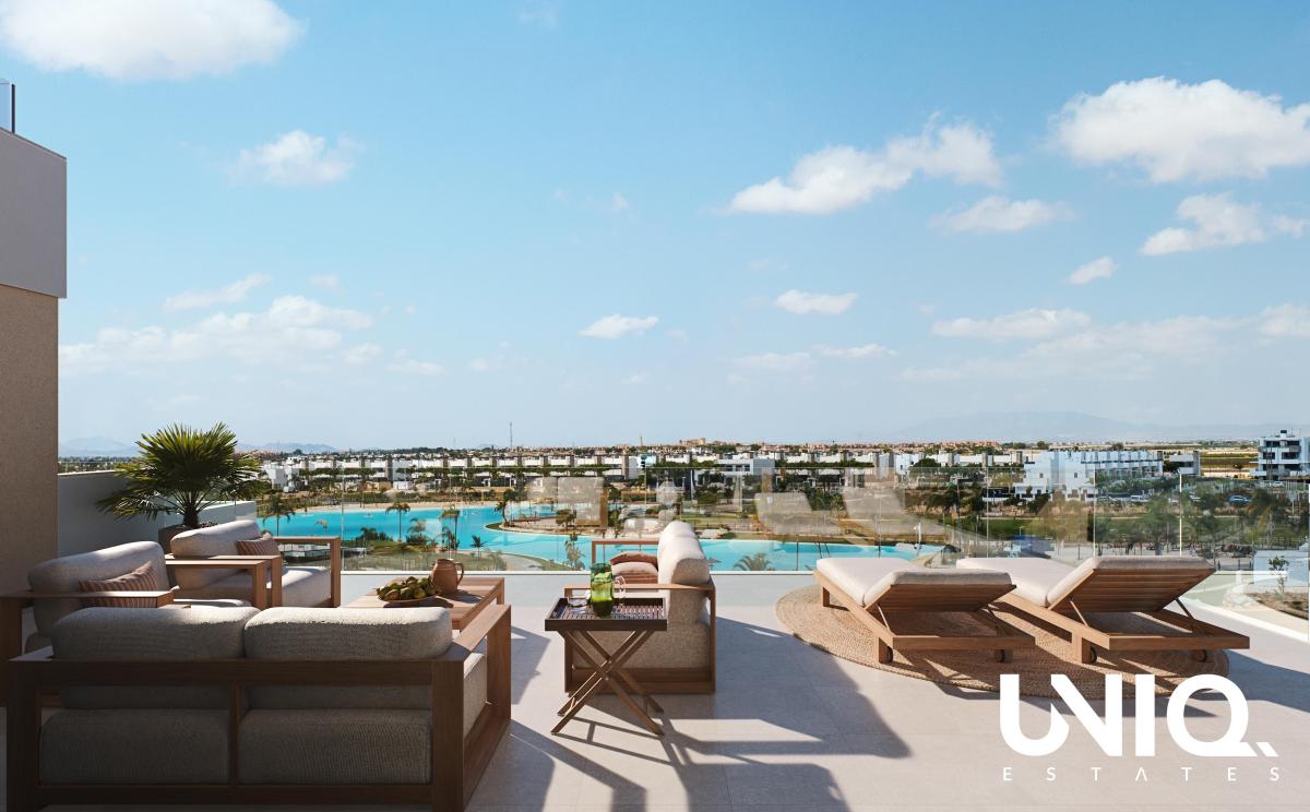 Les penthouses, bientôt disponibles, dans cette résidence squattée disposent chacun de 2 chambres et de 2 salles de bains. Ils sont rehaussés de murs blancs élégants et d'accents en bois en haut pour une touche ludique. Le penthouse sera entièrement équipé pour vous. Installation de climatisation, appareils de cuisine, lave-linge, chauffage au sol dans les salles de bains, spots, volets électriques, ... tout est compris dans le prix. L'espace de vie et la chambre principale s'ouvrent sur la terrasse au niveau du séjour par de larges fenêtres. Cela donne à votre appartement une belle lumière naturelle tout au long de la journée ! L'autre chambre, de l'autre côté, dispose également d'une large fenêtre. La terrasse au niveau du séjour mesure 15,5 m². Par un escalier intérieur, vous trouverez les portes du paradis : un solarium spacieux de pas moins de 57,5 m². Beaucoup d'espace pour bronzer, manger, boire, faire de l'exercice, ... le soleil espagnol est gratuit. Ce projet fantastique est situé dans un quartier agréable sans trop de passage, où vous avez à la fois la plage et les terrains de golf à portée de main. Un endroit où l'on se sent immédiatement chez soi.
