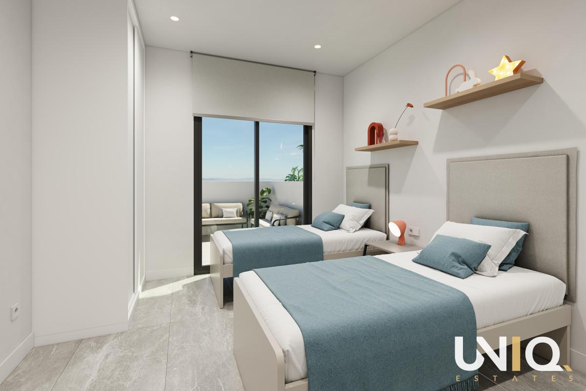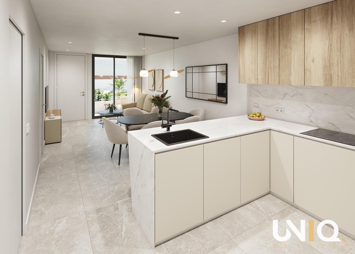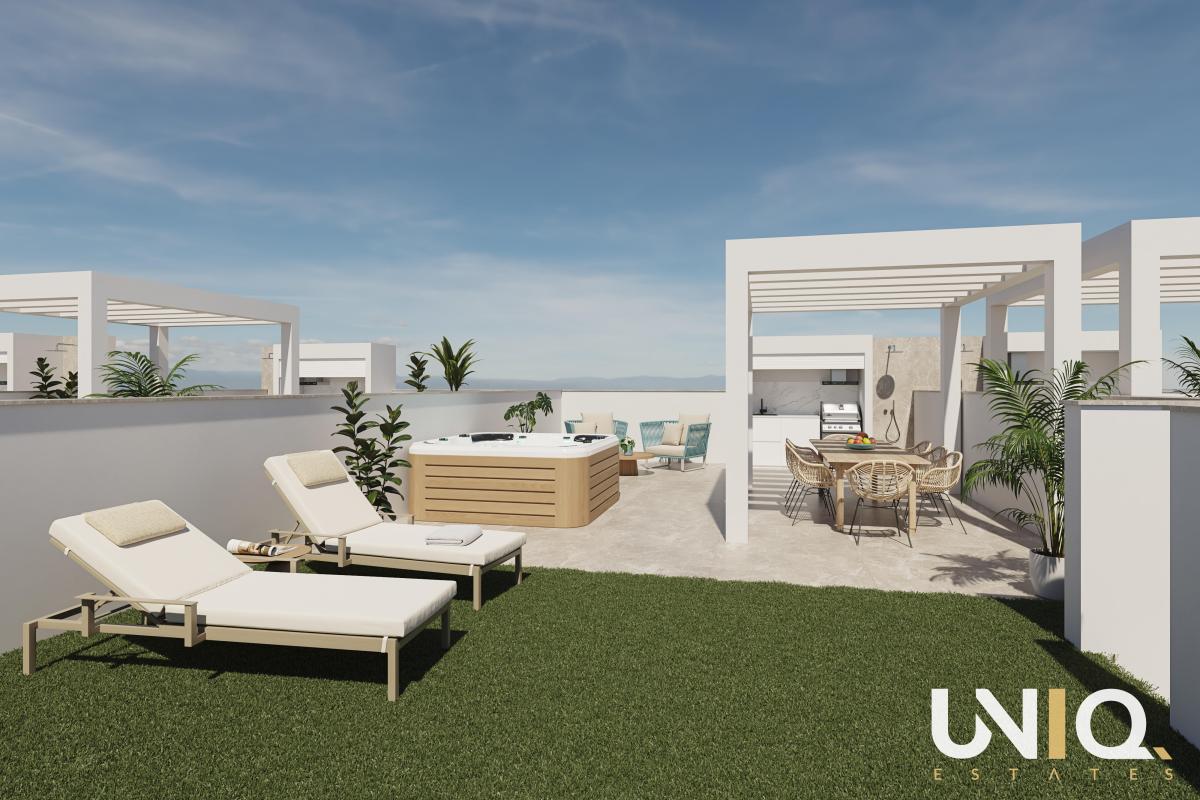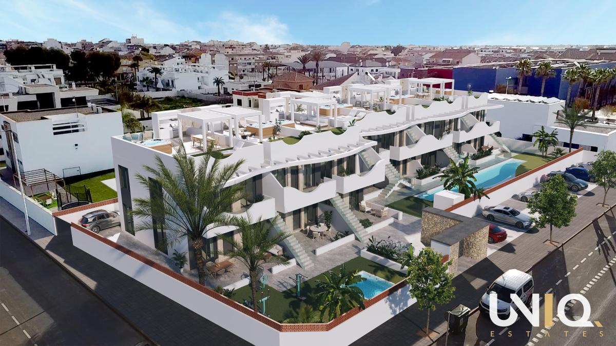 On a sunny corner in popular Pilar de la Horadada, an elegant residential project is being developed where design and quality of life go hand in hand. In this residence, you will live in style, in a modern single-story home with a private garden or a penthouse with a spacious roof terrace — each designed to maximize your enjoyment of Mediterranean life. The ground floor homes offer a harmonious transition between indoors and outdoors, with a spacious terrace at the front and a private garden where you can enjoy breakfast in the sunshine. If you opt for a penthouse, you will find a spacious solarium with pergola, outdoor kitchen with barbecue, outdoor shower, and even pre-installation for a jacuzzi. Each home is a place to live, relax, and enjoy — all year round. Inside, you will find a bright and well-thought-out interior with refined materials. Think large-format porcelain floors, smooth plastered walls and ceilings, and stylish bathrooms with walk-in showers, glass walls, and high-quality finishes. The kitchens are fully equipped with modern appliances. All homes are equipped with air conditioning via a multi-zone system, underfloor heating in the bathrooms, and a home automation system that allows you to control lighting, shutters, and access remotely. The windows are fitted with sun-resistant double glazing, so it always stays pleasantly cool inside. The gated residence offers a communal swimming pool with sunbathing area, a heated jacuzzi, an outdoor gym, and parking spaces with pre-installation for electric charging points. Peace and privacy go hand in hand with convenience and accessibility here: you live close to the center and a short distance from the beaches. A unique opportunity for those looking for a contemporary home with character and comfort in one of the most popular areas of the Costa Blanca.